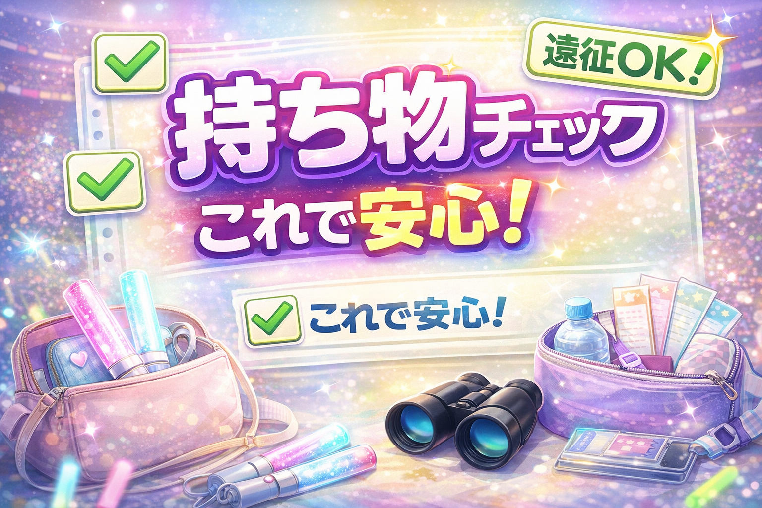 快適に過ごすなら ✔ 双眼鏡(後方席・アリーナ会場) ✔ サコッシュ・ボディバッグ ✔ 飲み物(ペットボトル) ✔ 汗拭きシート